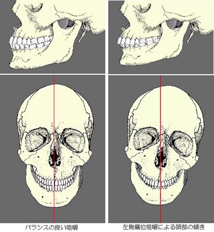 むし歯や歯列不正などの歯科異常がある場合、噛みにくいところでは自然と噛まなくなるため、どうしても噛み癖が生じます。この噛み癖は、通常噛んでいる側の歯の磨り減りなどによって首から上の頭の位置の変化(重心バランス異常)が起こるようです。